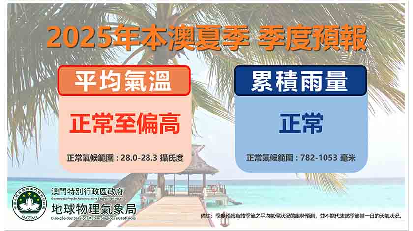【本報訊】氣象局綜合最新的模式預報資料,預測今年本澳夏季(6月至8月)的平均氣溫將屬於正常至偏高;而降雨方面,預測整季累積雨量將屬於正常,其中有機會出現極端強降雨過程。