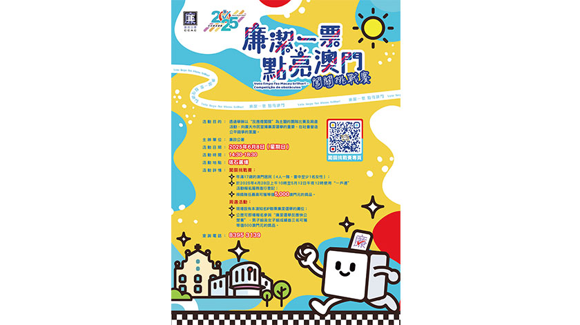 闖關挑戰賽將於當日下午2時半至6時半舉行,同場亦設有多項周邊活動,包括本澳知名IP聯乘廉潔選舉及其他以廉潔選舉為主題的攤位遊戲,完成遊戲者可獲限量版紀念品。周邊活動毋須提前報名,歡迎市民到場參與。