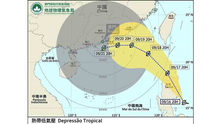 昨晚八時,熱帶低氣壓集結在澳門東南約1220公里處﹝約北緯 15.6 度,東經 122.9度﹞,以時速約15公里向西北偏北方向移動。