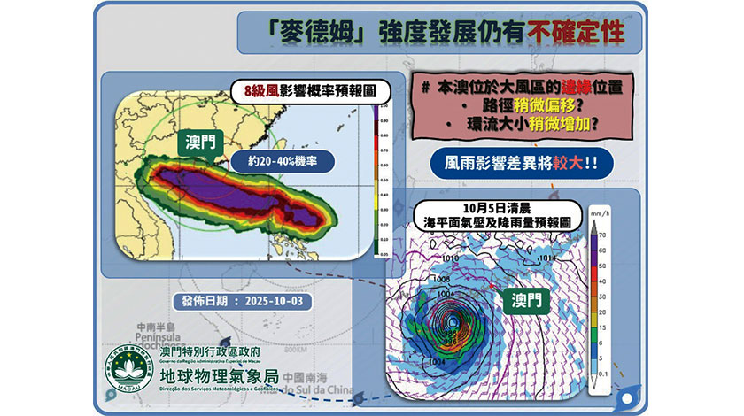 【本報訊】熱帶氣旋「麥德姆」昨日進入本澳八百公里範圍,氣象局於深夜十一時發出一號風球。氣象局指,「麥德姆」移動速度較快,大致趨向雷州半島至海南島一帶,有機會增強至颱風或以上級別,本澳今日(周六)下午開始風勢顯著增強,間中有大驟雨,因此今日下午發出三號風球的機率為高。預料「麥德姆」於周日凌晨至早上最接近本澳,屆時本澳將位處其最大風力區域(8級風或以上)的邊緣,氣象局將視乎風力情況考慮發出更高風球。