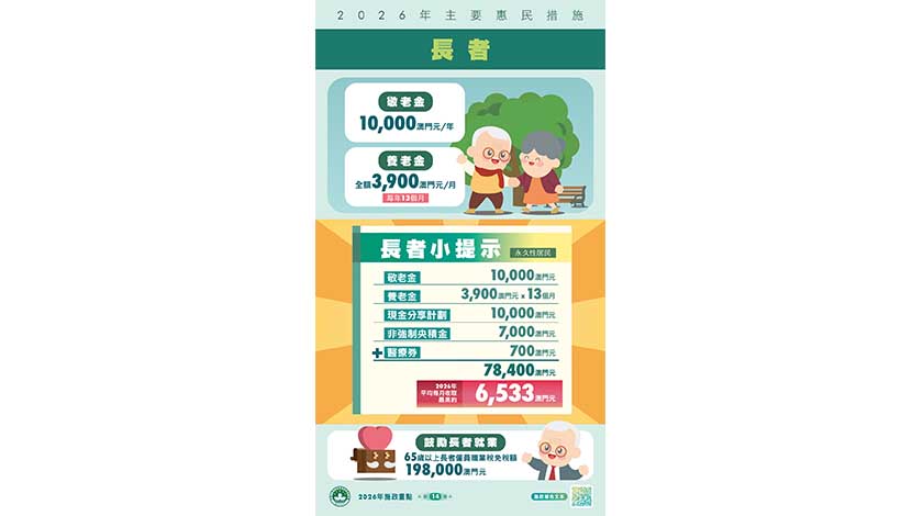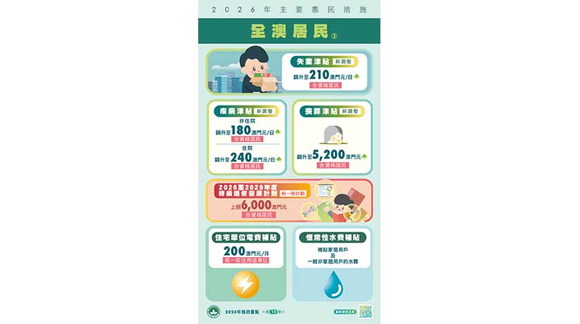 明年主要惠民措施延續包括:現金分享合資格永久居民一萬元、非永久居民七千元;合資格居民非強制央積金個人帳戶額外注入七千元;醫療券七百元;新期持續進修計劃(二六至二九年度)六千元;住宅單位電費補貼每月二百元等。
