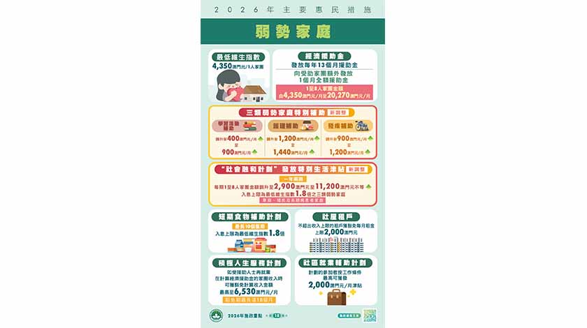 支援弱勢家庭方面,調升三類弱勢家庭特別補助:學習活動補助由每月四百至九百元,護理補助一千二百至一千四百四十元,殘疾補助由九百元至一千二百元。社會融和計劃的發放金額升至二千九百元至一萬一千二百元不等。