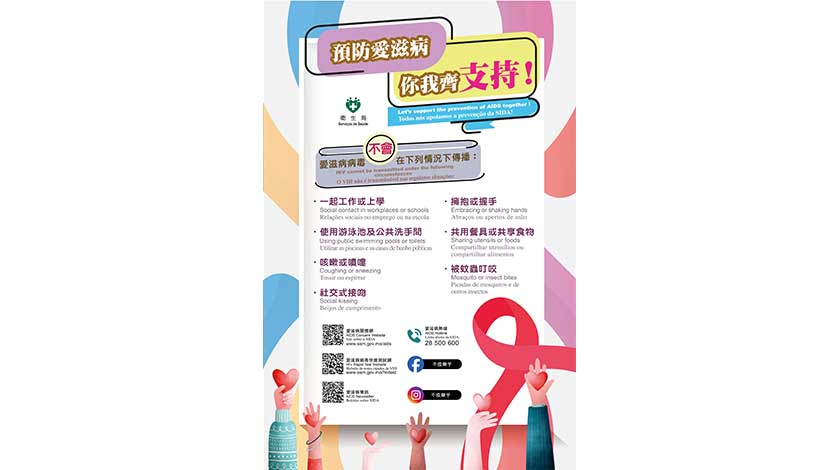【特訊】為響應12月1日“世界愛滋病日”,落實《健康澳門藍圖》邁向“終止愛滋病流行”的目標,衛生局以“資源下沉”、“關口前移”、“觀念轉變”三大政策方向,透過“健康社區”計劃推動愛滋病“三早”措施,即 “早發現、早診斷、早治療”,提升居民對預防愛滋病的認識和整體健康水平。