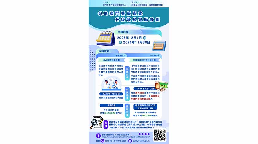 【特訊】由澳門生產力暨科技轉移中心主辦,經濟及科技發展局、藥物監督管理局支持的“促進澳門醫藥產業升級發展鼓勵計劃”,將由12月1日起接受符合資格的澳門藥廠或藥品持有人申請。