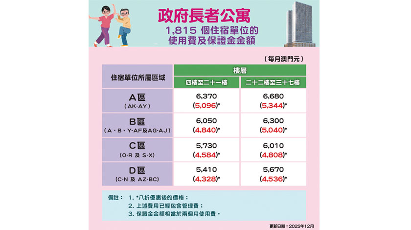 【特訊】特區政府經綜合考慮社會意見及長者的實際需求,宣佈凡於2026年12月31日或之前提出申請政府長者公寓住宿單位的合資格長者,亦可享有使用費八折優惠,並於2026年加推297個住宿單位,以鼓勵更多有需要長者申請使用公寓。