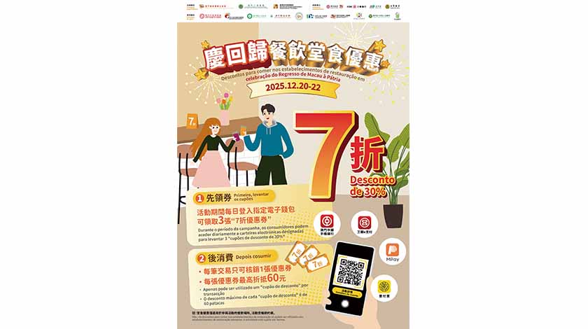 為慶祝特區成立26周年及提振社區消費活力,特區政府聯同澳門餐飲業聯合商會及澳門工商聯會,於12月20日至22日期間推出“慶回歸餐飲堂食優惠"。居民在指定移動支付工具手機應用程式領取活動優惠券後,透過電子支付,即可於全澳超過500間餐飲商戶享受堂食7折堂食消費優惠。
