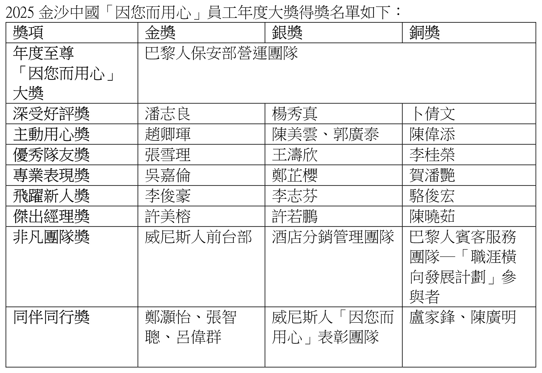 金沙百強優秀員工及團隊出爐