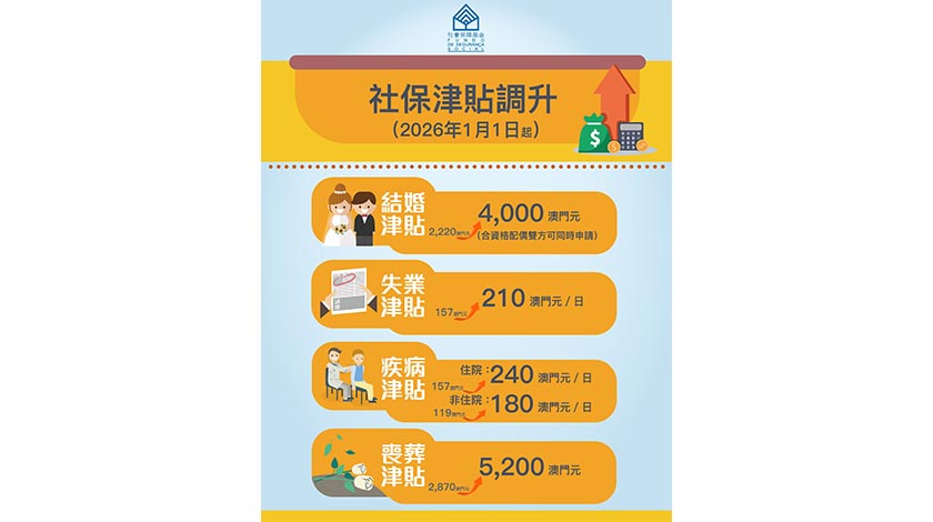 社會保障制度作為居民全生命周期的基本保障,出於對居民在面臨重要人生節點的關懷,以及在面對突發狀況時的支援,自2026年1月1日起調升四項津貼的金額。調升後,結婚津貼由原來2220元(澳門元,下同)調升至4000元,合資格配偶雙方可同時申請,失業津貼調升至210元/日、疾病津貼方面,住院津貼調升至240元/日,非住院津貼調升至180元/日、喪葬津貼調升至5200元。
