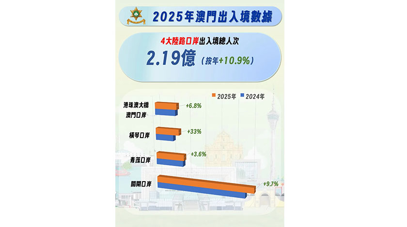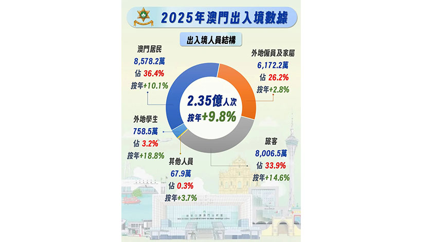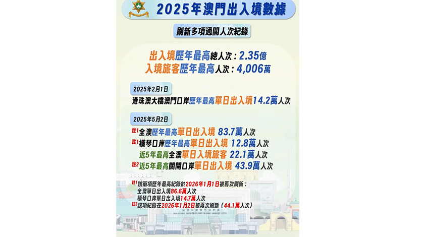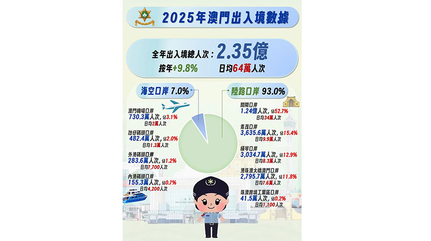 【本報訊】治安警察局昨詳細總結剛過去的二○二五年全年本澳出入境情況,除訪澳旅客創新高的四千○六萬人次外,各口岸出入境共錄得二億三千五百萬人次也刷歷史新高,兩者按年分別上升百分之九點八和百分之十四點七。