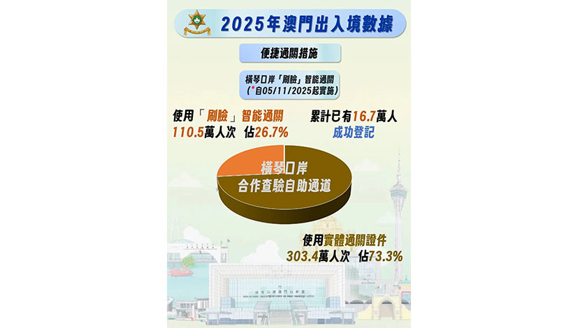 去年十一月上旬橫琴口岸開闢「刷臉」智能通關,至今累計已有十六萬七千人登記,在該口岸合作查驗自助通道上,用實體證通關的佔百分之七十三點三,有三百○三萬四千人次,而用「刷臉」通關佔百分之廿六點三、一百一十萬五千人次。