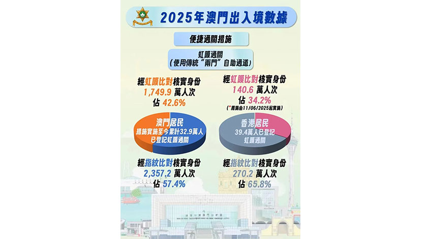 當中已登記虹膜通關的本澳居民至今累計有三十二萬九千人,過去一年使用傳統「兩門」自助通道中,經虹膜比對核實身份的出入境澳人有一千七百四十九萬九千人次,佔比百分之四十二點六,而經指紋比對的則有二千三百五十七萬二千人次,佔百分之五十七點四。