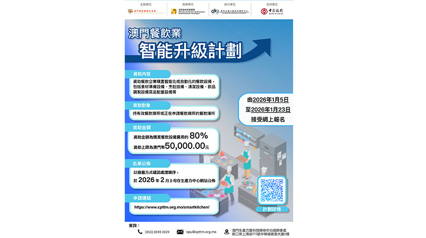 【特訊】由澳門餐飲業聯合商會主辦、澳門生產力暨科技轉移中心執行的“澳門餐飲業智能升級計劃”,由1月5日起接受申請,該計劃旨在支持本澳中小型餐飲企業利用智能或自動化設備進行轉型升級,歡迎符合資格的企業申請。