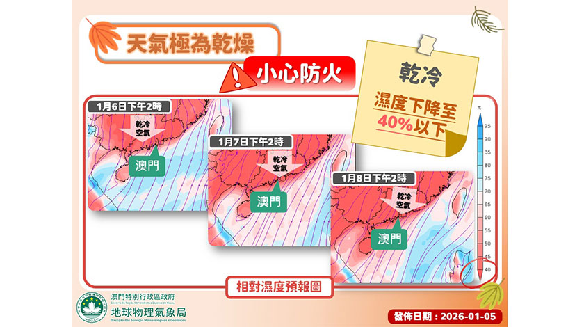 由於這股冬季季風伴隨相當乾燥的大陸性氣流,受其影響,本澳天氣將變得極為乾燥,相對濕度將下降至百分之四十以下,提醒市民在天乾物燥下注意保暖及補充水分,務必增強防火意識,杜絕火災隱患。