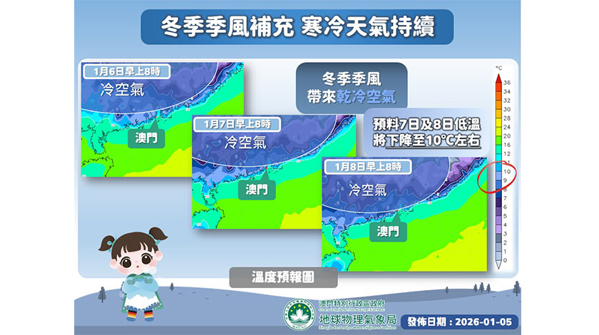 一股冬季季風補充於昨晚抵達廣東沿岸,本澳氣溫於昨日日間略為回升後再度下降,料周內降至寒冷水平,今日(周二)至周五最低氣溫介乎九至十度左右,氣象局指,由於日間陽光充沛,日夜溫差會相當大,屬典型「乾凍」天氣。