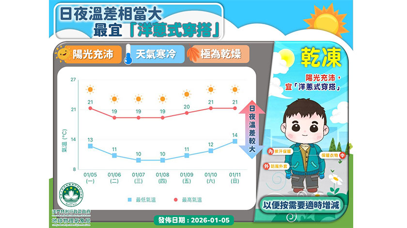 【本報訊】受冬季季風補充影響,料本澳氣溫再度下降至寒冷水平,本周最低降至攝氏九度,且溫度體感會較實際溫度更低。同時由於日間陽光充沛,日夜溫差較大,天氣極為乾燥,氣象局籲巿民適時添衣,宜「洋蔥式」穿搭,並小心防火。