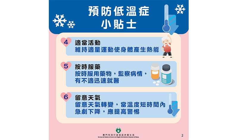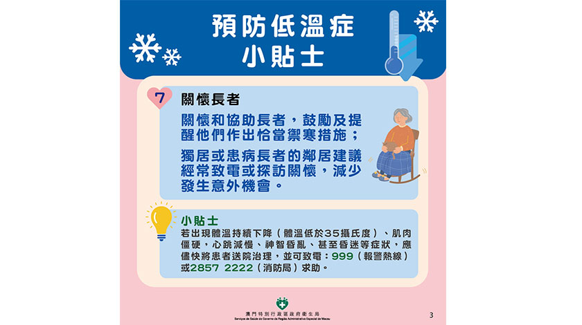 為有效預防低溫症,衛生局建議長者、慢性病患者及其照護者和相關機構落實以下措施: