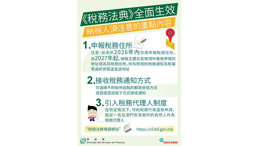財政局提醒,倘未於2026年內完成稅務住所申報,自2027年起,將以納稅主體在各稅項中最後申報的地址視為其稅務住所,所有稅務文件將寄送至該地址。