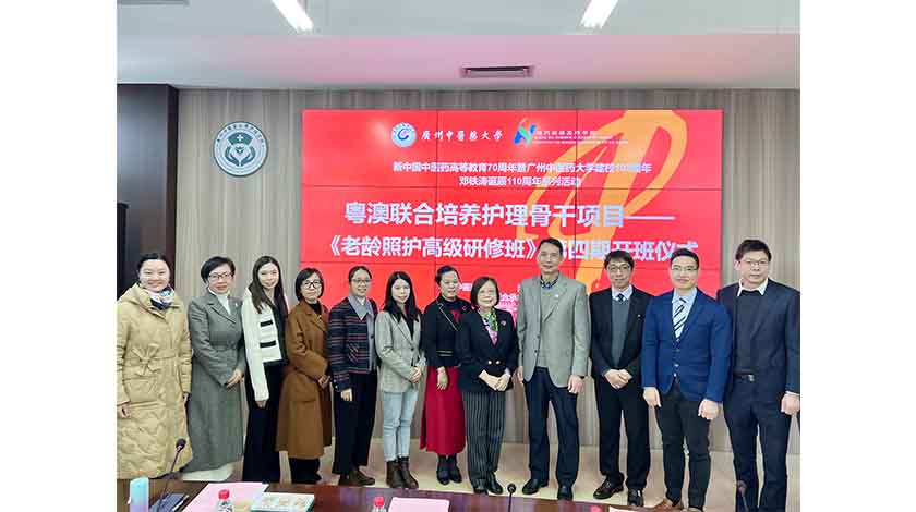 【特訊】為深化澳門老齡照護人才培養、加強粵澳兩地護理學術交流與合作,2026年1月6日,由澳門鏡湖護理學院與廣州中醫藥大學護理學院聯合主辦的粵澳聯合培養護理骨幹項目——《老齡照護高級研修班》(第四期)開班儀式暨線下授課活動,在廣州中醫藥大學大學城校區護理樓隆重舉行。本期研修班是兩校攜手打造的品牌項目,標誌著粵澳護理協同發展邁向深化階段,也為大灣區衛生健康事業注入新的動力。