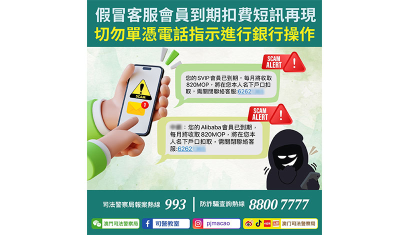 【特訊】司警局於昨發現有騙徒再次假冒銀行發送虛假短訊,訛稱客戶會員到期並即將收費,如要取消需按指示聯絡客服辦理。上述詐騙手法與去年在本澳首現並高發的假冒平台客服電話詐騙相同,倘市民誤信短訊內容主動聯繫假客服,騙徒將會以驗證身份、辦理退費等理由要求市民進行視頻通話、分享屏幕、提供個人及銀行帳戶資料、甚至轉帳至指定帳戶等操作,藉此詐騙市民金錢。