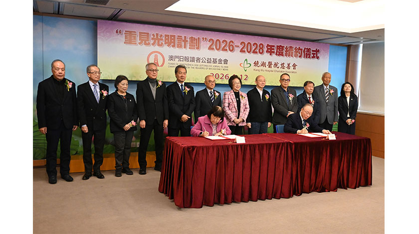 「重見光明計劃二○二六—二○二八年度」續約儀式昨在鏡湖霍英東大樓舉行,澳日公益金、鏡湖慈善會、醫院代表,以及眼科中心醫護等人士出席,見證雙方簽署新份協議。