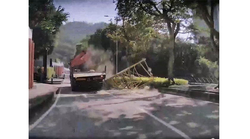 交通警員下午一時許據報到場處理,初步調查該大型金屬鐵架墮落時對路面和石壆造成損毁。肇事吊臂貨斗車上六十歲男司機涉嫌彎位未能控制車速、載貨不安全及貨物超出貨斗等違規行為被檢控。