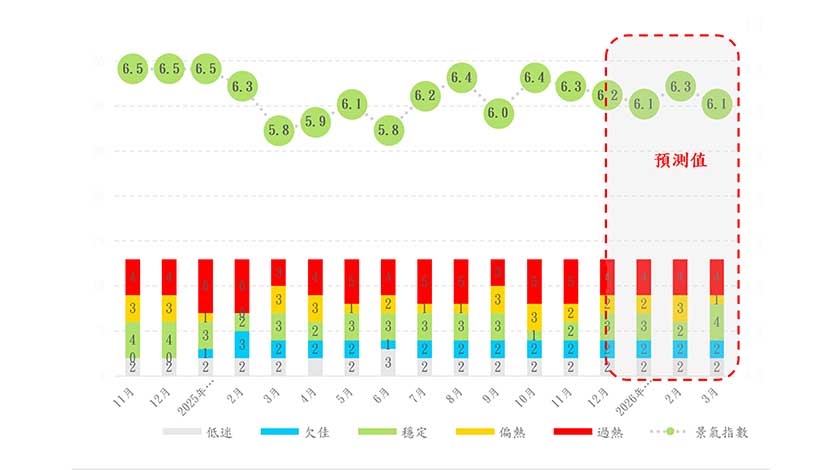 然而,隨着經濟社會轉變,整體發展不平衡,社區經營環境面臨深刻複雜變化,整體經濟呈現“冷暖並存”,民生區中小微企業經營壓力仍然突出。經綜合研判和推算,預料今年第一季本澳經濟景氣指數將維持於6.1分至6.3分區間,整體景氣表現可望持續呈現“持續平穩”態勢。