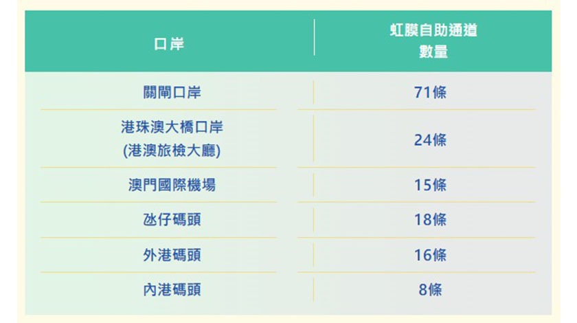 治安警察局指,由於虹膜通關高效便捷,深受歡迎,當局於2024年,在六個口岸增設71條第二代虹膜自助通道,緊接於2025年再增加71條,現時全澳虹膜自助通道已達152條。