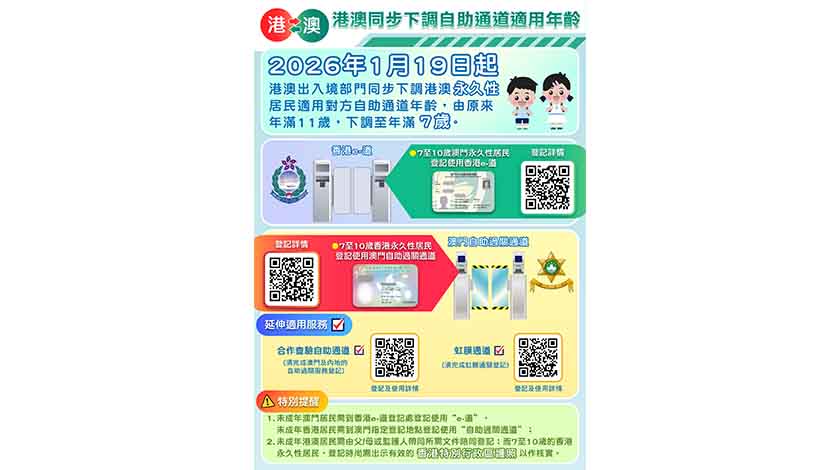 【特訊】為貫徹落實《粵港澳大灣區發展規劃綱要》,積極參與大灣區建設,治安警察局、身份證明局、澳門保安部隊事務局與香港入境事務處持續聯手優化港澳通關便利措施。上述部門共同決定,自2026年1月19日起,港澳兩地永久性居民使用對方自助過關通道(即香港的e-道及澳門的傳統兩門式自助通道),適用年齡由原來的年滿11歲,下調至年滿7歲;另外,兩地年滿18歲的合資格非永久性居民可使用本地自助服務機進行預先登記,成功登記後約3小時即可使用對方自助過關通道(香港的e-道及澳門的傳統兩門式自助通道)入出境。