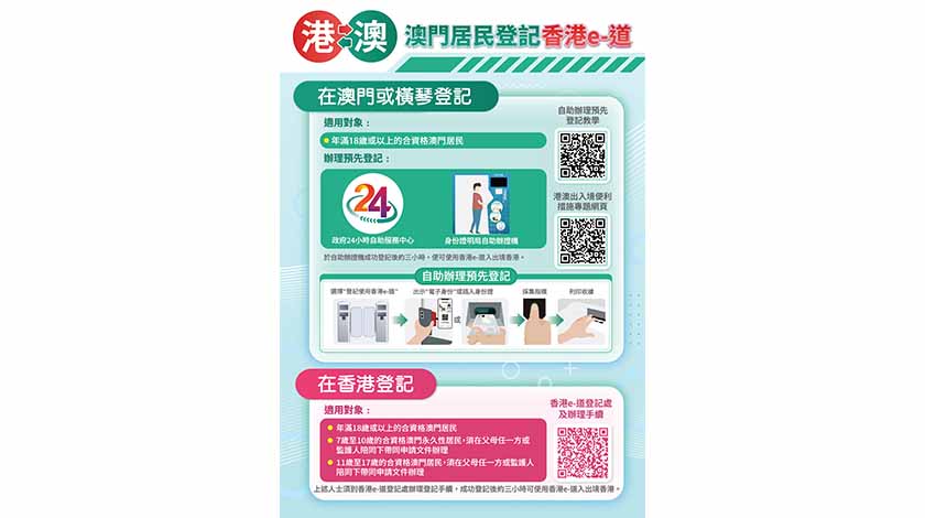 自2026年1月19日起,年滿18歲,持用澳門居民往來香港特別行政區旅遊證的澳門非永久性居民,除可前往香港入境事務處的e-道登記處登記使用香港e-道服務外,也可在澳門8個政府24小時自助服務中心,以及橫琴政務服務中心24小時自助服務區和“澳門新街坊”澳門政務24小時自助服務中心使用澳門政府的自助辦證機進行登記;年滿18歲,並持有有效的香港居民身份證及有效期多於90天的香港特別行政區簽證身份書的香港非永久性居民,除可於澳門的自助通關登記處登記使用澳門自助過關服務,也可使用設於香港指定管制站或各人事登記辦事處的自助登記服務機預先登記。