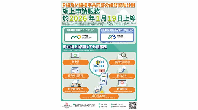 截至2026年1月9日,“P級及M級樓宇共同部分維修資助計劃”已批核4341宗個案,涉及3354幢樓宇,批准金額為5.1億多澳門元,為《樓宇維修基金》批核個案及金額最多的資助項目。