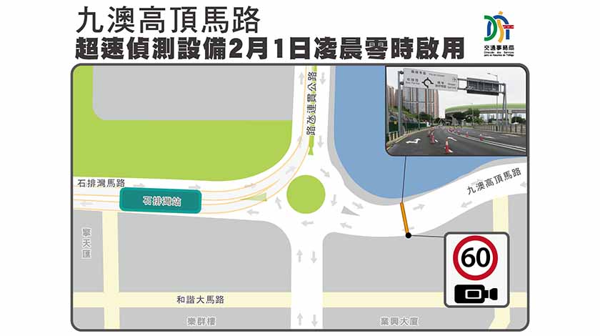 【特訊】為保障道路使用者的安全、回應區內團體和居民意見,九澳高頂馬路、黑沙馬路、賈梅士大馬路合共4個地點的超速偵測設備於2月1日(周日)凌晨零時啟用。(詳情可查閱附表及附圖)。相關安排經交通事務局與治安警察局協調,並已獲交通高等委員會審議通過。