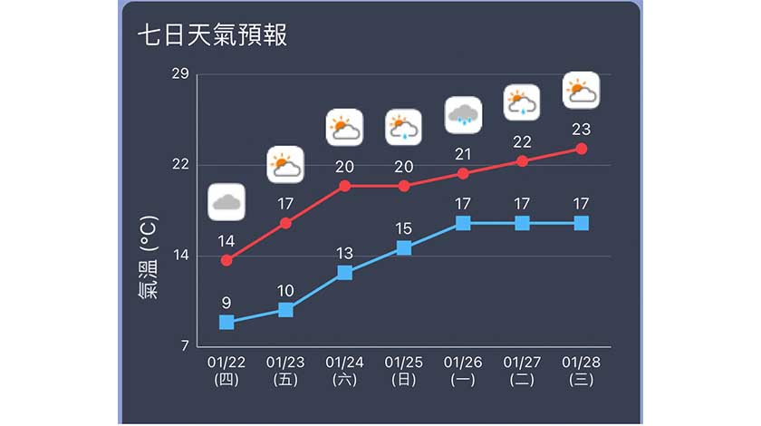 周五天氣寒冷、多雲、短暫時間有陽光,氣溫約為十至十七度;周六天氣多雲、部分時間有陽光,氣溫約為十三至二十度;周日多雲、短暫時間有陽光,晚間有微雨,氣溫約為十五至二十度。