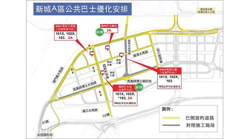 為方便A區居民前往民生及社會公共設施區域,經評估實際條件及平衡公交資源分配,將逐步優化A區公共巴士服務,包括於泰安大馬路近東城、東創大廈之間位置計劃增設一個巴士臨時站,以及延伸2A路線至A區,並以東城第三街增設之臨時巴士總站為總站,增加前往中南區的出行路線選擇;另計劃103路線擴展覆蓋至祐漢區範圍,讓居民有更多出行及轉乘選擇;同時優化居民步行前往巴士站的動線及距離,相關措施預計農曆新年前實施。