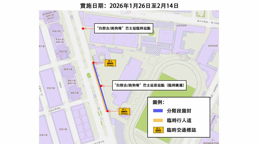 配合施工需要,1月26日日間路線首班車起,“白朗古/跑狗場”巴士站將往青洲大馬路方向臨時遷移約100米,供1(往媽閣)、5X(往皇朝)、23(往旅遊塔)、25B(往橫琴澳方口岸)、33(往筷子基)及N1B(往亞馬喇前地)路線乘客上落,至2月14日首階段有蓋行人道工程完成後將遷回原位。同時,原巴士站及相關區域將設為臨時行人道(詳見附圖1)。