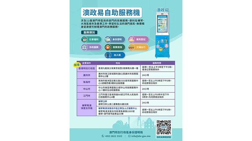 有關“澳政易”自助服務機的詳情,請參閱相關專題網頁:https://www.dsi.gov.mo/mo-eservice/。