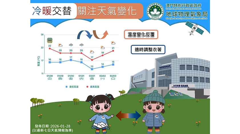 氣象局提醒,近期本澳氣溫變化幅度較大,冷暖交替變換頻繁,同時早晚溫差亦較明顯,市民應留意天氣變化,關注家中長者、體弱人士及幼兒,注意適時添衣保暖。