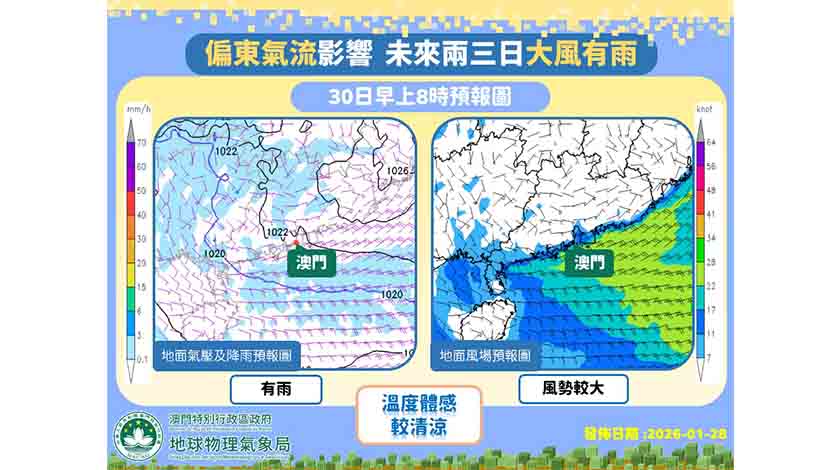 【本報訊】受一股偏東氣流影響,預料本澳未來兩日大風有雨,另預料一股東北季風將於周六晚間抵達華南沿岸,屆時本澳氣溫將再度下降,預測下周初最低氣溫將降至攝氏十二至十三度左右。