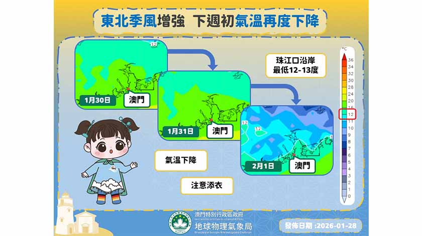 另外氣象局預料,一股東北季風將於周六晚間抵達華南沿岸,屆時本澳氣溫將再度下降,預測下周初(2月1至2日)珠江口沿岸的最低氣溫將降至十二至十三度左右。然而,不同模式對降溫幅度仍存在一定差異,氣象局表示將適時調整最新氣溫預測。