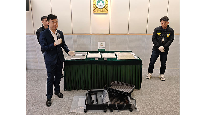司警局為加强打擊國際跨境販毒活動,根據情報结合風險排查,得知一月三十一日經國外抵澳的一航班有一名可疑乘客。司警員立即在澳門國際場步署,在治安警和海關協助下,司警員在姓HONG目標男子提取行李箱後採取行動,對行李箱內物品清空後發現重量異常,最終在行李箱兩側暗格內發現兩膠袋包裝的白色顆粒物品,而兩膠袋表面塗滿刺鼻的辣椒油及咖啡粉,相信是用作掩蓋毒品的氣味,企圖逃避緝毒犬的嗅覺偵查。