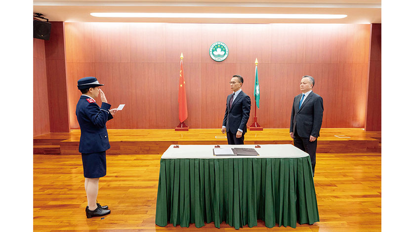 【特訊】昨日上午在保安司司長辦公室舉行澳門海關助理關長就職儀式,儀式由保安司司長陳子勁主持,並在海關領導及一眾官員的見證下,吳嘉慧關務總長進行宣誓及簽署就職狀,就任為海關助理關長。
