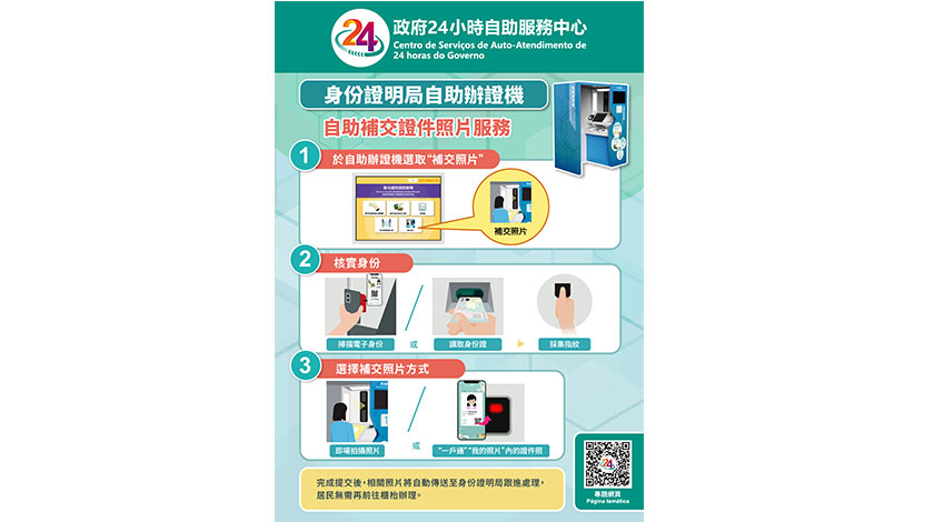 為簡化居民補交證件照片的手續,即日起,收到補交照片通知的澳門特區居民身份證、澳門特區旅行證件及往港旅遊證的申請人,可前往澳門8個政府24小時自助服務中心,以及橫琴政務服務中心24小時自助服務區和“澳門新街坊”澳門政務24小時自助服務中心,使用澳門政府的自助辦證機完成補交手續。申請人只需選擇“補交相片”服務項,透過實體身份證或電子身份,以及指紋核實身份後,便可選擇使用在自助辦證機即場拍攝的照片,或“一戶通”“我的照片"內的證件照作為補交照片。完成提交後,相關照片將自動傳送至身份證明局跟進處理,居民無需再前往櫃枱辦理。