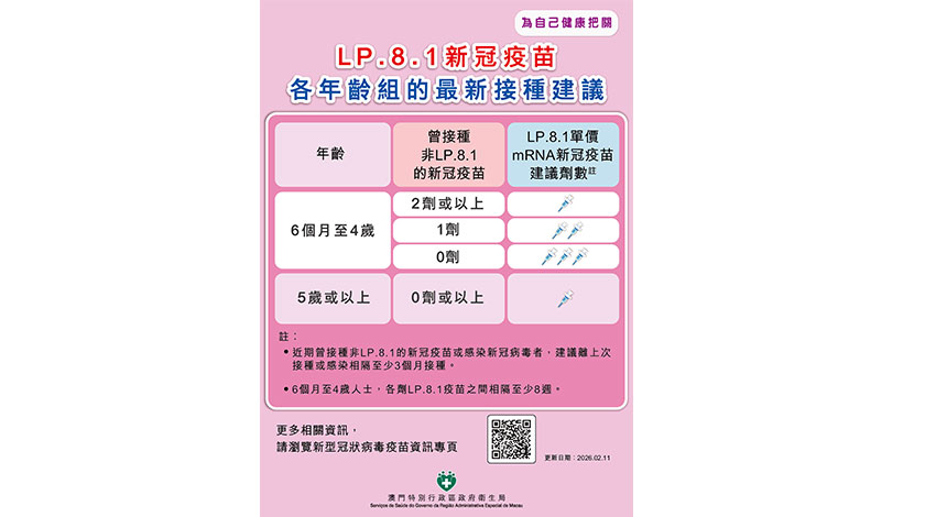 【特訊】為降低新冠病毒感染相關重症和死亡風險,衛生局根據世界衛生組織建議,已購買適用於6個月或以上人士接種的Comirnaty LP.8.1單價mRNA新冠疫苗(以下簡稱LP.8.1新冠疫苗),並將於2月12日開放預約系統,2月13日起供應接種,具體安排如下: