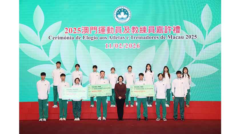 【特訊】為表彰在2025年度參加體育比賽中獲得優秀成績的本澳運動員、教練員及技術輔助人員,以及為鼓勵澳門體育代表團在今年各項大型體育賽事中創造佳績,「2025澳門運動員及教練員嘉許禮暨2026體育代表團誓師儀式」2月11日晚上七時半舉行,社會文化司司長柯嵐等出席儀式,勉勵並祝賀一眾運動健兒。