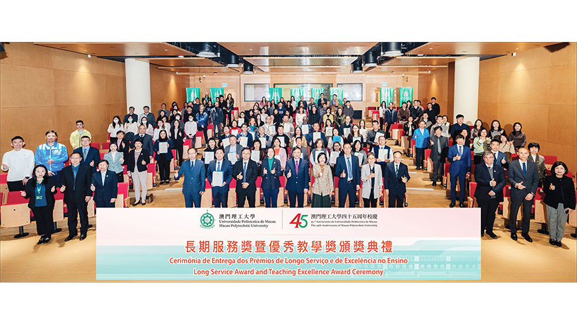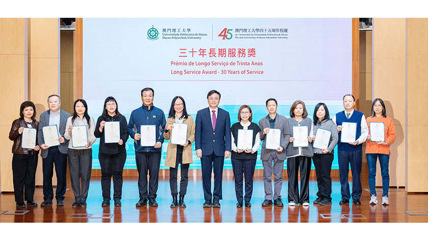 【特讯】為表彰長期服務員工的卓越貢獻與教學創新教師的傑出表現,澳門理工大學舉行“長期服務獎暨優秀教學獎頒獎典禮”,向於澳理大服務滿10年、20年及30年的員工頒發“長期服務獎”以及向獲獎教師頒發“線上教學優秀案例獎”。澳理大行政管理委員會成員、學術及行政單位主管,以及教職員工共200多人出席,場面歡欣感人。