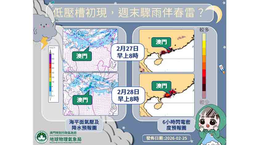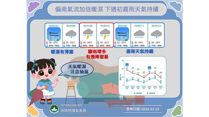 【本報訊】氣象局預測,本澳今明兩日(26至27日)天氣溫暖潮濕;周末期間( 27至28日)間中有驟雨,有可能出現本年首次雷暴;元宵節氣溫稍降。