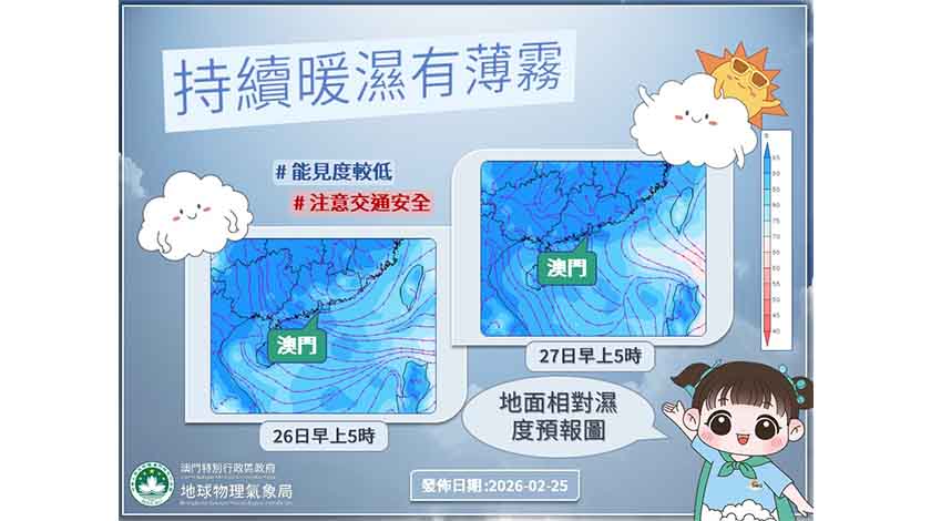 氣象局表示,農曆新年過後,本澳天氣逐漸回暖,將正式進入春季,天氣變化將更明顯。受偏東氣流影響,本澳今明兩日天氣溫暖潮濕,早晚有薄霧,能見度較低。
