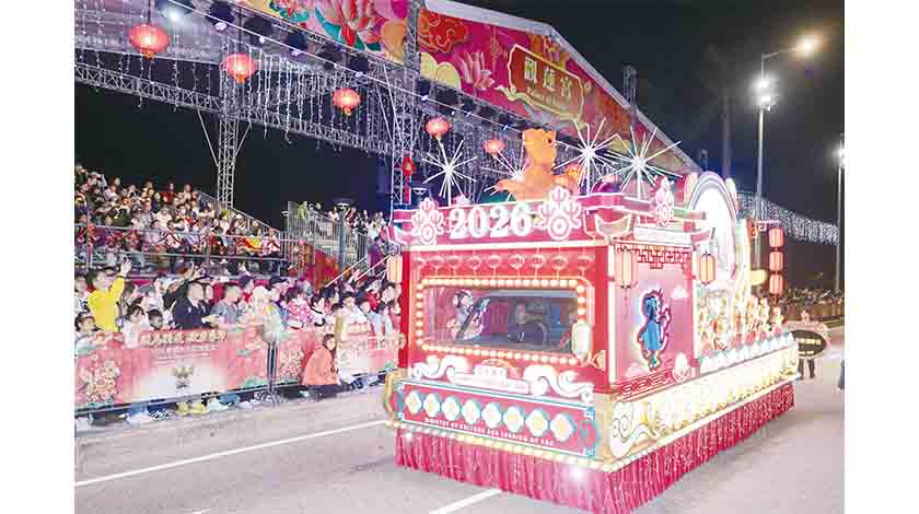 由澳門旅遊局主辦、亞洲旅遊交流中心、市政署、經濟及科技發展局、招商投資促進局、文化局、體育局和橫琴粵澳深度合作區經濟發展局協辦的“駿馬騰飛 歡樂春節 2026農曆新年花車匯演”於(2月19日)晚在西灣湖廣場隆重開幕。配合首辦的“金駿雲翔 歡樂春節”無人機煙花匯演,以及“歡樂春節─2026年龍騰舞躍賀新春”社區巡演,三項活動已獲國家文化和旅遊部納入“歡樂春節”活動框架,共同呈現澳門節慶與文旅融合的特色,吸引眾多居民與旅客到場觀賞,現場氣氛熱烈。