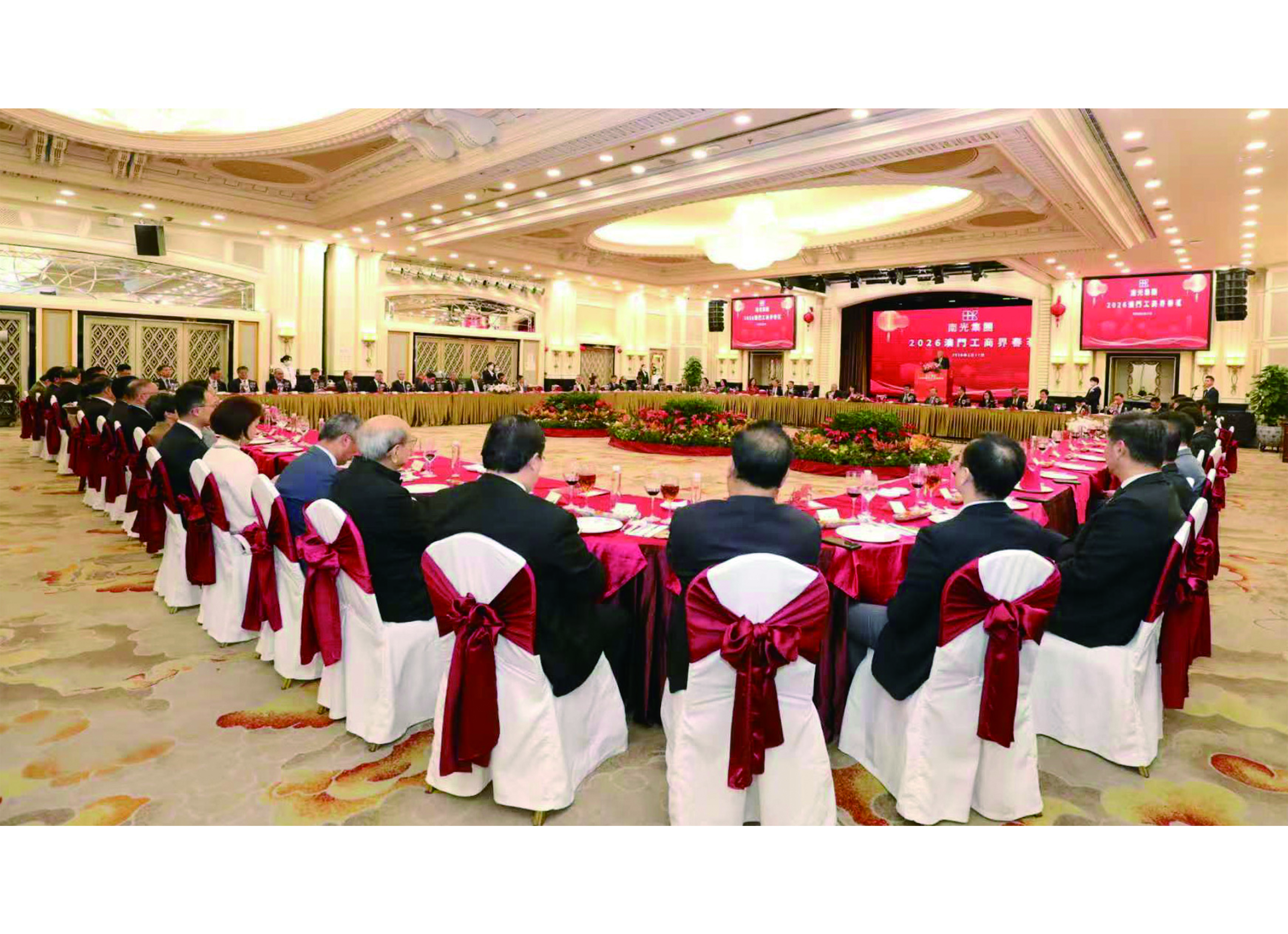 【特訊】本澳南光集團於昨(3月17日)晚在萬豪軒舉辦2026年澳門工商界春茗。澳門中聯辦經濟部副部長楊全州,澳門特區政府經濟財政司司長代表財政局局長何燕梅、運輸工務司司長代表環境保護局副局長韋海揚、政策研究和區域發展局局長張作文、公共資產監督管理局代局長廖志漢、旅遊局局長文綺華、勞工局局長陳元童、公共建設局局長林煒浩,澳門中華總商會永遠榮譽會長許世元、會長崔世昌,澳門工商界人士及社會各界代表受邀出席。南光集團董事長傅建國出席活動並致辭,集團領導班子及有關職能部室、二級公司負責人參加活動,與澳門工商界人士深入交流,場面熱烈。