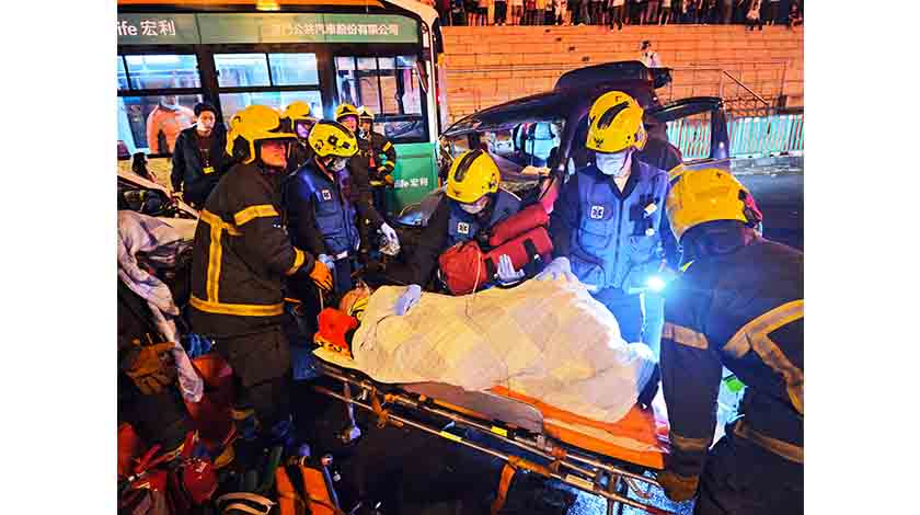 昨晚七時三十消防和警方接報友誼大馬路近賽車看台彎位發生嚴重交通意外,消防員到場發現有兩部七人車和一部巴士發生相撞,兩部七人車車頭嚴重撞毁,巴士車頭部分凹陷和車頭玻璃碎裂,路面滿佈大量水碼及車輛碎片。現場其中一部深色七人車上一名男駕駛者腿部被壓困於車廂内,路邊另有兩男一女傷者待援。
