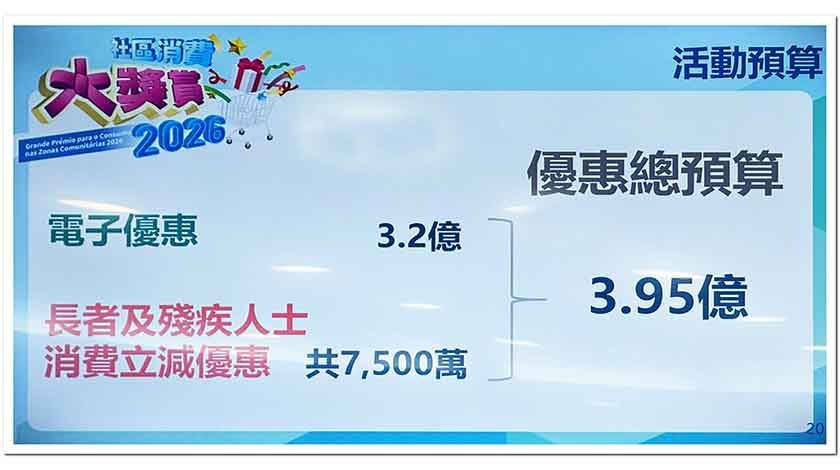特區政府與澳門中華總商會定於下月十日至六月十八日合辦為期十周的「二○二六社區消費大獎賞」(https://pse.is/8vnn33)。今次優惠總預算共三億九千五百萬元,當中,電子優惠為三億二千萬元,長者及殘疾人士消費立減優惠為七千五百萬元,合資格領取消費立減優惠的長者和殘疾人士約十五萬。